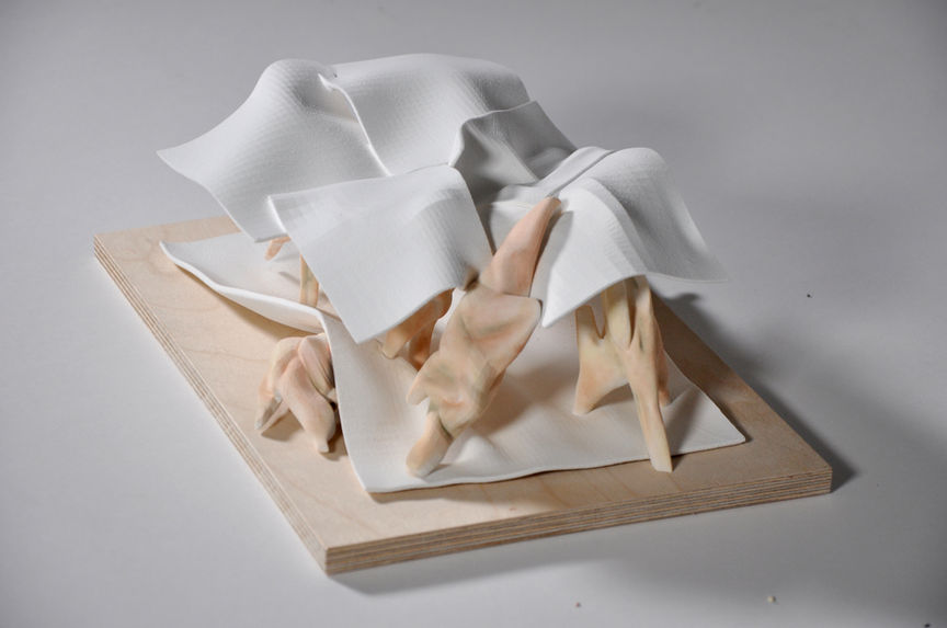 If the Maison Dom-Ino reveals the distinct functions of slab and column, the Second Hut casts the anthropomorphic column against the object of the slab. Counter to the typical sequence of assembly, the slabs of the Second Hut precede the columns in their placement, as the found objects. The anthropomorphic columns, charged with intention, populate the slabs and seek to move them apart vertically. The stair, in turn, uses the upper slab to pull itself up, and tilts both affected slabs as a consequence. The intention of the column is directed toward pre-existing entities that differ from itself in their nature. This ultimately gives one a collapsed chronology of architectural construction, in which the effort of man does not serve to place effective architectural parts, but rather, embodies both the effort of construction and firmitas. This is a group project completed Bijan Thornycroft and Samantha Vasseur.