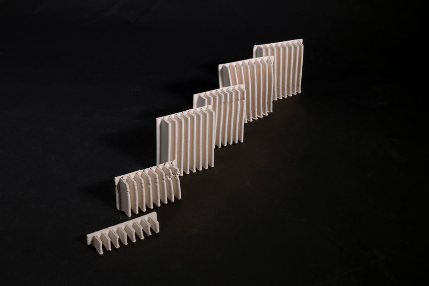 These complex geometries were only realizable via ceramic 3D printing. The gyroscopic sink design create large surface area for evaporation as well as a stable structure during drying and firing process. The end product is a parametric tile design that can be retrofitted onto interior walls and ceiling.